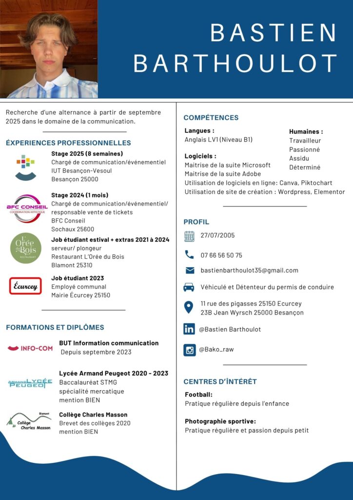 Actuellement en deuxième année de BUT Information-Communication à Besançon, parcours Communication des Organisations, je développe mes compétences en stratégie de communication, en gestion de projets et en création de contenus. Cette formation me permet d’allier ma passion pour le sport et la communication, tout en intégrant des éléments graphiques dans mes réalisations, avec l’ambition d’évoluer dans ce domaine.